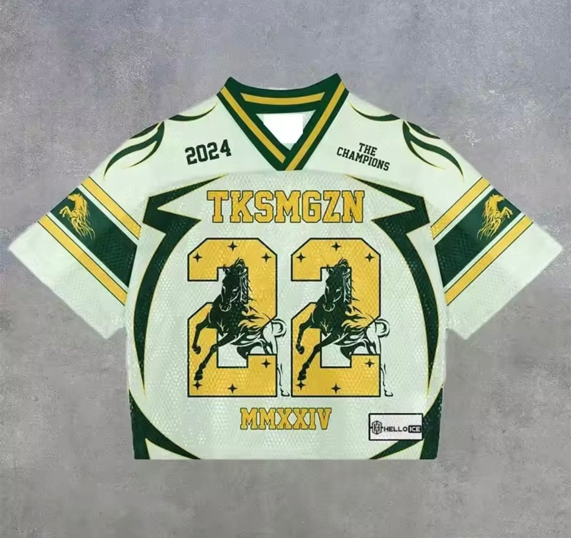 Step up your streetwear game with the TKSMGZN “The Champions” 2024 Jersey Tee — Perfect for festivals, streetwear looks, or casual outings — this jersey makes a statement wherever you go.
